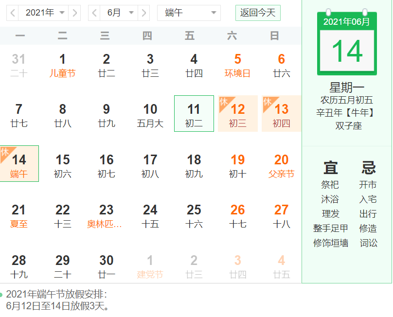 端午節將至,根據國務院節假日放假規定,并考慮公司的實際情況,公司將2021年端午放假做以下安排,具體明細如下: